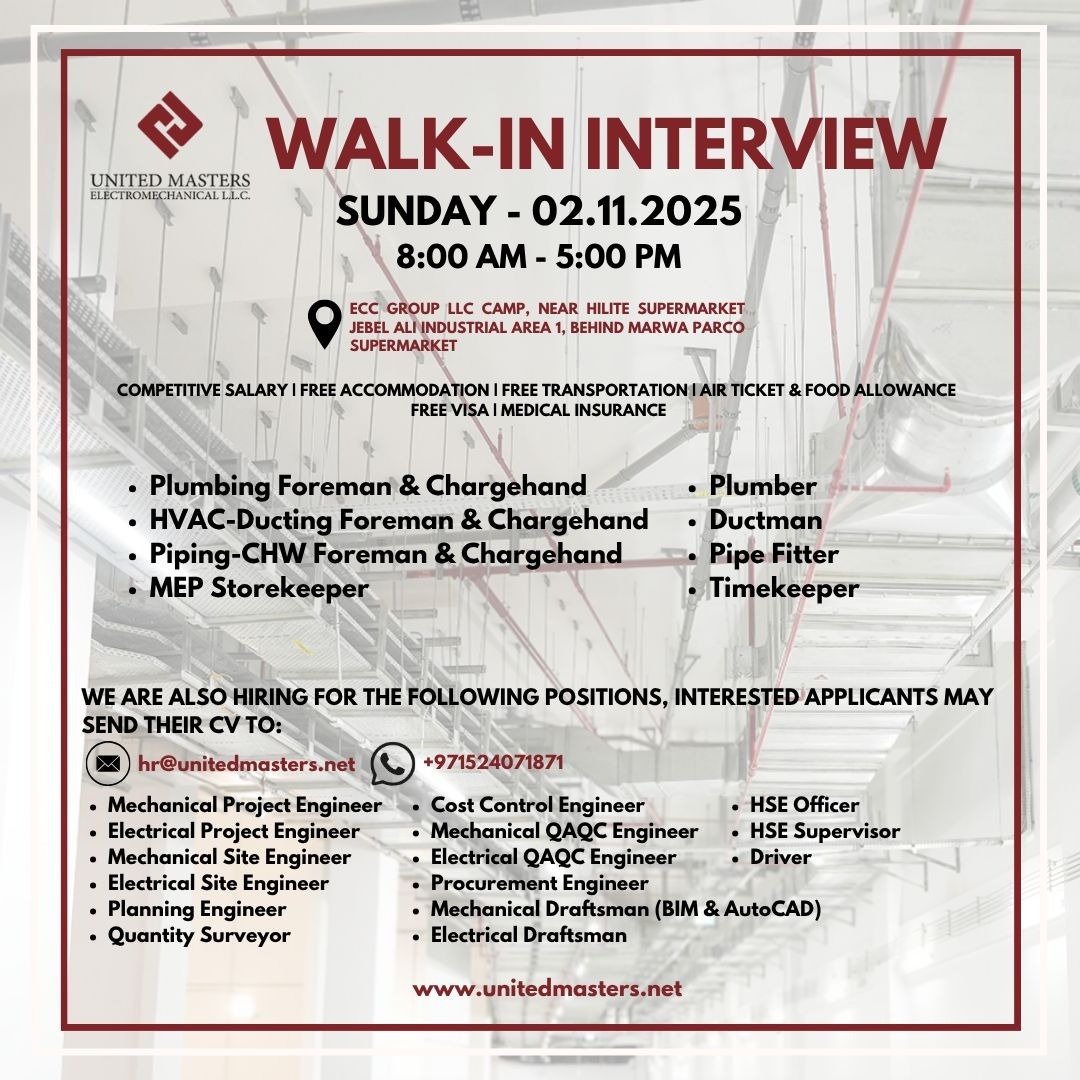 Candidates interested in these roles are encouraged to attend the United Masters Walk in Interview in Dubai on the specified dates. For further inquiries or to send your CV to [email protected]. Don’t miss this opportunity to join a dynamic team at United Masters Electromechanical and advance your career in the MEP industry.