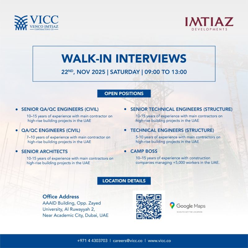 Venco Imtiaz Contracting Company (VICC), a proud member of the Imtiaz Developments group, has been operating in the region for over 20 years. Renowned for its excellence in civil and construction projects across the UAE, VICC is dedicated to delivering not just structures, but transformative community experiences. As part of its ongoing expansion, VICC Walk in Interview in Dubai presents an excellent opportunity for experienced professionals in the civil engineering sector to join a visionary organization that shapes the future of real estate development 📢.