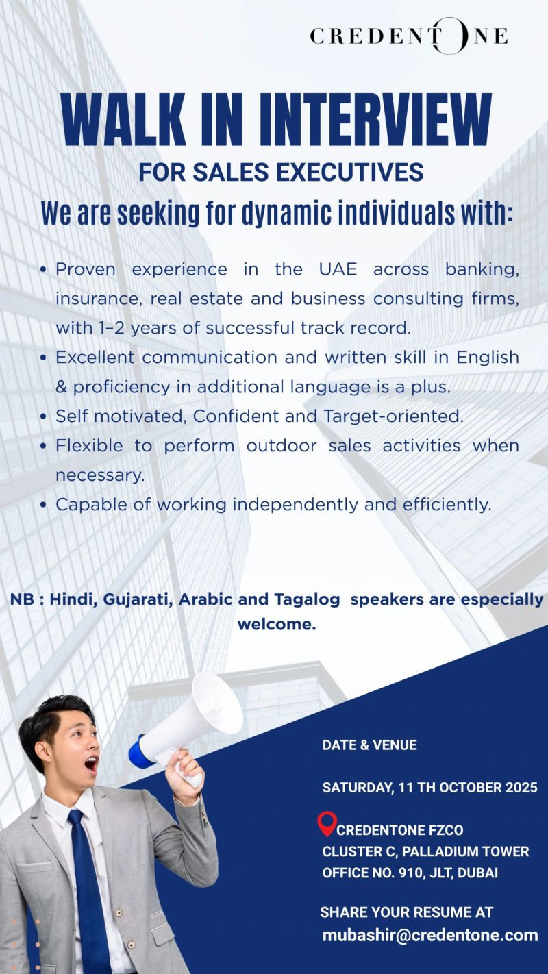 If you are a passionate sales professional looking for the right opportunity to advance your career, here is some exciting news. CredentOne, a well-known name in the UAE business consulting sector, is conducting CredentOne Walk in Interview in Dubai. This is a great chance for ambitious individuals to step into a dynamic role and work with a team that values growth and innovation 📢.