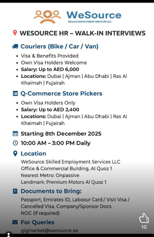 With competitive salaries, benefits, and multiple locations to choose from, WeSource HR Walk in Interviews in Dubai present a valuable chance for both experienced and new entrants in the courier and retail sectors to secure rewarding employment. For further information, candidates can reach out via email at [email protected]. The company encourages all eligible applicants to attend the interviews and explore the opportunity to join a reputed employment service provider in the UAE.