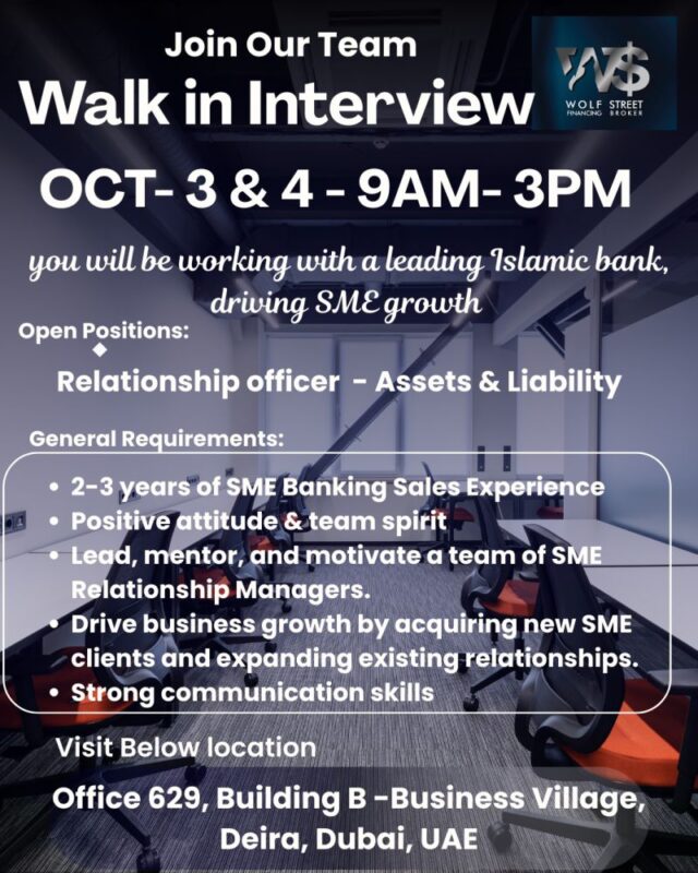 Wolf Street Financing Broker, a leading name in financial services, is inviting experienced professionals in SME banking to take part in its upcoming Wolf Street Walk in Interview in Dubai. This initiative aims to attract skilled Relationship Officers to join a dynamic team and contribute to SME growth in collaboration with a prominent Islamic bank π’.