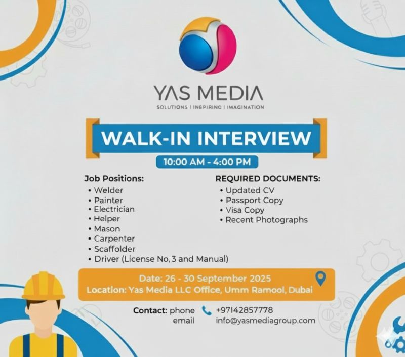 YAS Media, a leading media and creative agency in Dubai, is organizing YAS Media Walk in Interview for multiple positions. The company is seeking talented professionals for roles that support its growing operations, offering candidates the chance to be part of a dynamic and creative team π’.